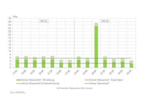 Wasserstoffpreisindex in den Kalenderwochen 25 und 26 (zur Vollansicht bitte auf die Grafik klicken) Quelle: enervis energy advisors GmbH / EEX |