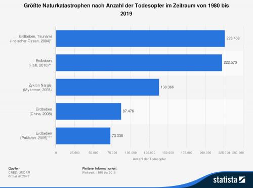 Im Dezember 2004 forderte ein Tsunami in weiten Teilen Ostasiens 226.408 Todesopfer. Die Flutwellen waren die Folge eines schweren Erdbebens der Stärke 9,1 auf der Richterskala. Betroffen waren neben Thailand auch Sri Lanka, Indonesien, Indien, Bangladesch, Myanmar, die Malediven und Malaysia. Der Tsunami war seit dem Jahr 1980, gemessen an den Todesopfern, die größte Naturkatastrophe weltweit. Die meisten Naturkatastrophen fanden in den vergangenen rund 20