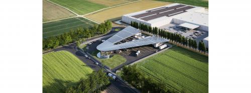 Luftperspektive des Wasserstoff-Hubs in Gengenbach: Auf dem Dach ist eine PV-Anlage vorgesehen. Wasserstoff-Trailer verteilen den im Hub produzierten Wasserstoff in die Region Quelle: Hadi Teherani Architects |