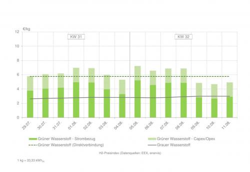 | Wasserstoffpreisindex in den Kalenderwochen 31 und 32 Zur Vollansicht bitte auf die Grafik klicken Quelle: enervis energy advisors GmbH / EEX |