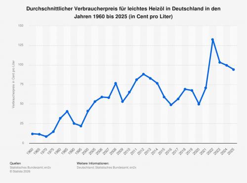 Heizölpreise sind wie Kraftstoffpreise wichtige Kostenfaktoren für Verbraucher. Der durchschnittliche Heizpreis in Deutschland lag im Jahr 2025 (Stand: Dezember) auf einem Niveau von etwa 94,2 Cent pro Liter. Ursächlich hierfür sind nicht zuletzt die Entwicklungen des Rohöl-Weltmarkts. Die Zahlen stammen vom Statistischen Bundesamt und En2x.