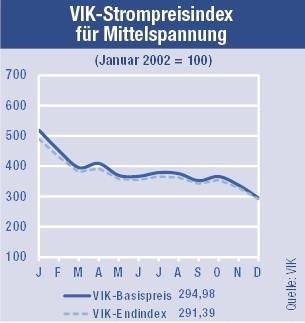 Die vom Verband der Industriellen Kraftwirtschaft veröffentlichten VIK-Indizes sind auch im Dezember gesunken. Wie der Verband der Industriellen Energie- und Kraftwirtschaft (VIK) mitteilte, verlor der Basisindex gegenüber dem Vormonat um 42