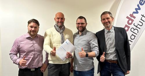 V.l.: Carlo Lazar (Geschäftsführer Vertrieb Aidon), Christoph Scharfenort (Verkaufsleiter Aidon), Felix Zösch (technischer Leiter und Prokurist Stadtwerk Haßfurt) und Norbert Zösch (Geschäftsführer Stadtwerk Haßfurt) Quelle: Stadtwerk Haßfurt |