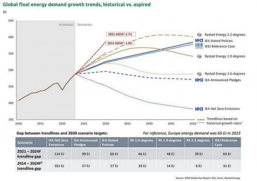 Der Report sieht im Gegensatz zur Prognose der Internationalen Energieagentur (IEA) künftig einen stark steigenden Erdgasbedarf, für den zu wenig investiert werde. Die IEA hatte im Juli 2024 für den globalen Energiesektor einen stagnierenden Erdgasbedarf und CO2-Emissionen prognostiziert, mit einem leichten Anstieg im Jahr 2024, gefolgt von einem Rückgang im Jahr 2025 (wir berichteten).