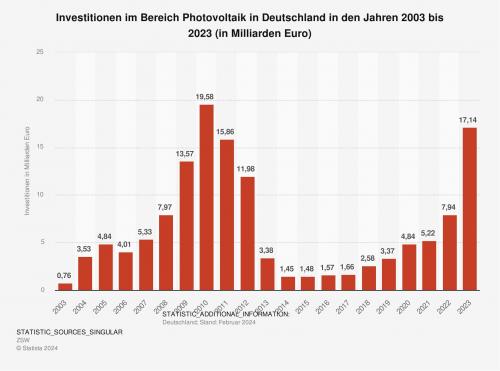 Die Statistik zeigt die Entwicklung der Investitionen im Bereich Photovoltaik in Deutschland in den Jahren 2003 bis 2023 nach Zahlen des ZSW. Im Jahr 2023 wurden in Deutschland rund 17,1