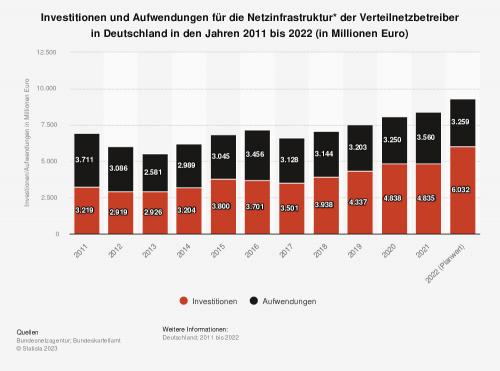 Die Statistik zeigt die Entwicklung der Investitionen und Aufwendungen für die Netzinfrastruktur der Verteilnetzbetreiber in Deutschland in den Jahren 2011 bis 2022. Im vergangenen Jahr planten die deutschen Verteilnetzbetreiber demnach Investitionen von über 6