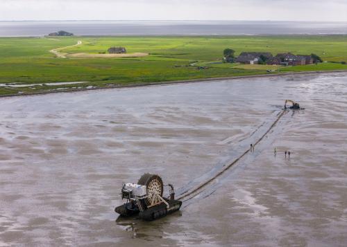 Meter tiefe Leerrohre eingerüttelt, und zwar teilweise auch bei Flut. Die Kabel sind leistungsfähiger und ersetzen Vorgänger aus den 50er- und 60er-Jahren. Die Schutzrohre waren bereits im Sommer 2023 versenkt worden, die Arbeiten sind im Weltnaturerbe nur von April bis September außerhalb der Vogelbrutzeit erlaubt. Der 25-Tonner bewegt sich mit einer Auflagefläche von mehr als 40