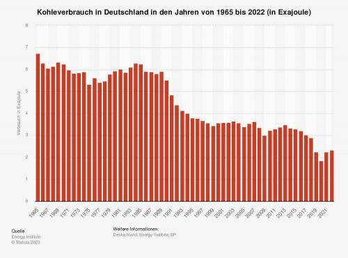Die Statistik zeigt den Kohleverbrauch von Deutschland in den Jahren von 1965 bis 2022. Berücksichtigt wurden ausschließlich handelsübliche feste Brennstoffe, etwa bitumenhaltige Steinkohle und Anthrazit (Hartkohle), Hart- und Weichbraunkohle. Im Jahr 2022 belief sich der Kohleverbrauch in Deutschland demnach auf rund 2,33 Exajoule. Die Werte stammen vom Energy Institute und BP.