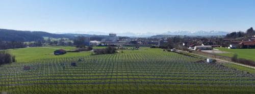 Im Vordergrund die Ständerung für die Agri-PV-Anlage, im Hintergrund das Nestle-Werk Biessenhofen Quelle: Nestle |