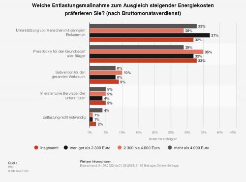 Aufgrund des Krieges in der Ukraine sowie einer steigenden Inflationsrate schossen die Energiepreise im Jahr 2022 in die Höhe. Mit verschiedenen Entlastungspaketen versucht die Bundesregierung die Folgen dieser enormen Preissteigerungen abzufedern. Laut einer im Sommer 2022 erhobenen Umfrage des WSI (Wirtschafts- und Sozialwissenschaftliches Institut) spricht sich ein Drittel der Befragten für die gezielte Unterstützung von Menschen mit geringem Einkommen aus. Unter den befragten Personen mit einem Bruttomonatsverdienst von weniger als 2.300