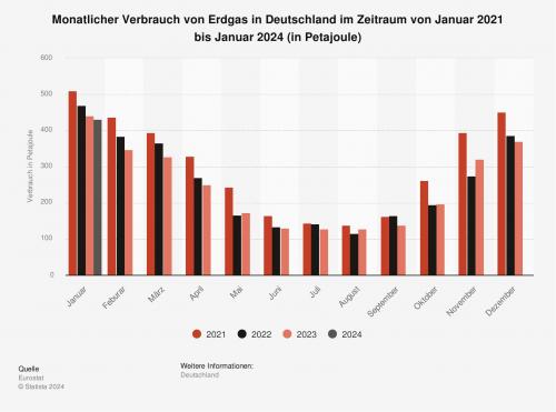 Im Januar 2024 wurden nach Zahlen von Eurostat in Deutschland knapp 431 Petajoule durch das Verbrennen von Erdgas erzeugt. Dies entspricht einer leichten Abnahme im Vergleich zum Vorjahresmonat.