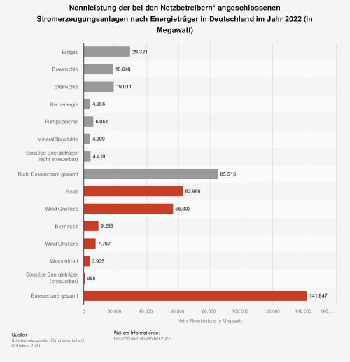 Die Statistik zeigt die Nennleistung der bei den Netzbetreibern angeschlossenen Stromerzeugungsanlagen nach Energieträger in Deutschland im Jahr 2022 (Stand: November 2022). Erzeugungsanlagen sind Anlagen, in denen sich eine oder mehrere Erzeugungseinheiten (Generatoren) elektrischer Energie befinden (einschließlich der Anschlussanlage) sowie alle zum Betrieb erforderlichen elektrischen Einrichtungen. Die Netto-Nennleistung der Windparks und -Anlagen auf See der deutschen Übertragungs- und Verteilnetzbetreiber betrug rund 7.800