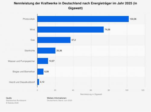 Im Jahr 2025 betrug die Nennleistung der Steinkohlekraftwerke in Deutschland rund 20,4 Gigawatt. Der Energieträger mit der höchsten Nennleistung war Photovoltaik, gefolgt von Windenergie, so das Statistische Bundesamt. Die Energieträger Braunkohle und Kernenergie wurden im Ranking nicht dargestellt, da die Nennleistung bei null lag.