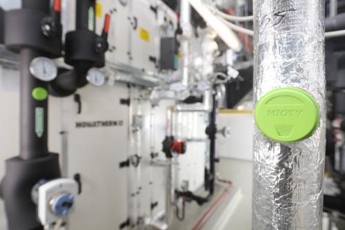 Mit einem Energiebedarf von weniger als 20 μWh pro Message sind Batterielaufzeiten der Devices von 20 Jahren oder mehr zu realisieren. Tatsächlich können die Mioty-Geräte vor Ort aber auch noch viel länger ohne Eingriff von außen funktionieren. Denn für solche Einsatzzwecke haben die Forscher des IIS das Konzept einer autarken Energieversorgung konzipiert. Dabei werden etwa Vibrationen oder leichte Temperaturschwankungen zur Stromerzeugung genutzt und über hocheffiziente Spannungsregler und Energiemanagementsysteme den Sendern zur Verfügung gestellt. In einem Beispielprojekt hat das IIS sein Energy Harvesting direkt in einen Sensor integriert, der sich an einem Heizungsrohr anbringen lässt und aus der Temperaturdifferenz zwischen dem warmen Rohr und der kälteren Umgebungsluft seinen Betriebsstrom erzeugt.