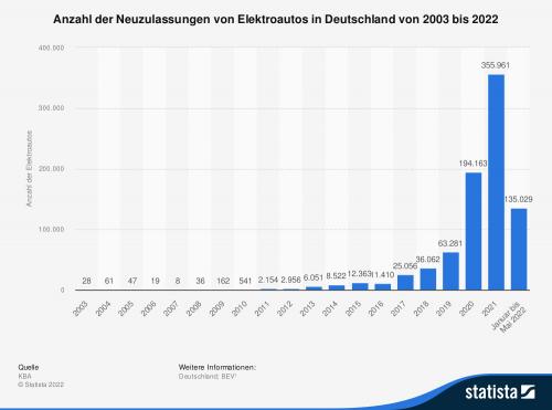 Rekordwert bei der Anzahl der Neuzulassungen von Elektroautos in Deutschland: Im Laufe des Jahres 2021 wurden mit rund 356.000 mehr Pkw mit reinem Elektroantrieb neu zugelassen als jemals zuvor. Das Jahr 2022 startete ebenfalls mit einem Zuwachs im Vergleich zum Vorjahreszeitraum. Bisher wurden in jedem Monat (außer April) mehr Elektroautos verkauft als im Vorjahresmonat.