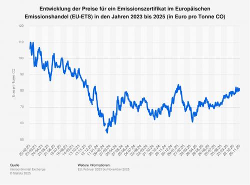 Der Preis für Emissionszertifikate im Europäischen Emissionshandelssystem (EU-ETS) erreichte im Februar 2023 mit 100,34 Euro pro Tonne CO2 ein Rekordhoch, sank aber bis Ende Februar 2024 auf rund 55 Euro. Anfang November 2025 lag der Preis bei rund 81,91 Euro pro Tonne CO2. Ein Grund für niedrigere Preise ist die geringe Nachfrage: Produziert die Industrie in der EU weniger als erwartet und verbraucht damit auch weniger fossile Brennstoffe, ist auch der Bedarf an Zertifikaten geringer und die Preise sinken. Die Nachfrage wird dazu durch eine erhöhte Verfügbarkeit von erneuerbaren Energien gesenkt.