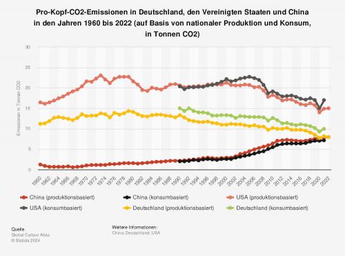 Im Jahr 2022 verursachte ein Einwohner Deutschlands nach Zahlen des Global Carbon Atlas durchschnittlich CO2-Emissionen in der Höhe von acht Tonnen. Die Pro-Kopf-Emissionen in China befanden sich im gleichen Jahr auf dem selben Niveau, in den USA betrugen sie etwa das Doppelte (15
