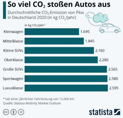 Ein Kleinwagen stößt pro Jahr im Schnitt 870 Kilogramm weniger CO₂ aus als ein großer SUV. Das zeigt die Infografik auf Basis des Statista Mobility Market Outlooks. Diese Differenz von 870 Kilogramm emittiert ein Zwei-Personen-Haushalt in etwa in einem Jahr durch seinen Stromverbrauch (dt. Energiemix von 2019).
