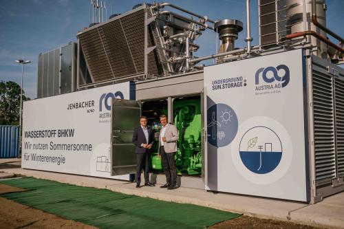 heizt jetzt ein 1-MW-BHKW in Gampern (Oberösterreich) so richtig ein. Betrieben wird die Jenbacher-Anlage mit grünem Wasserstoff, der im Sommer mittels Elektrolyse erzeugt und im weltweit ersten unterirdischen Wasserstoffspeicher in der Porenlagerstätte im 4