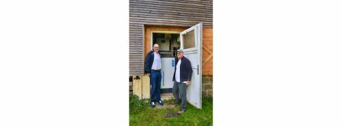 Steffen Böhme (rechts) und Vertriebsmitarbeiter Ost Mario Tröger von RMB/ Energie vor dem neuen BHKW Quelle: Martin Henze |