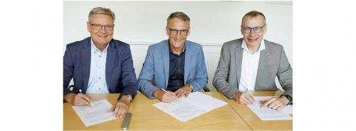 Klaus Preiser (Geschäftsführer Badenova Wärmeplus), Markus Ibert (Oberbürgermeister der Stadt Lahr) und Bernhard Palm (Vorstand des E-Werks Mittelbaden) unterzeichneten die Absichtserklärung zur Gründung einer Energie- und Wärmewendegesellschaft (EWWG) Quelle: Stadt Lahr |