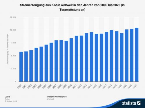 Im Jahr 2023 wurden weltweit insgesamt knapp 10.500 Terawattstunden Strom aus Kohle erzeugt. Das ist etwa doppelt so viel wie im Jahr 2000. Im Ländervergleich war China 2023 der weltweit führende Produzent von Strom aus Kohle. Fast die Hälfte des insgesamt erzeugten Stroms stammte aus China. Quelle Statista