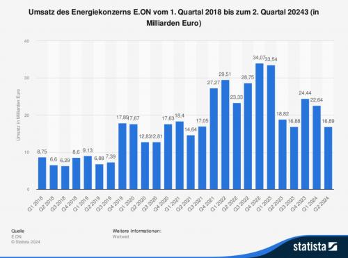 Die Statistik vom August 2024 zeigt die Entwicklung der Quartalsumsätze des Energiekonzerns Eon vom 1. Quartal 2018 bis zum 2. Quartal 2024. Im 2. Quartal 2024 erwirtschaftete die Eon SE einen Umsatz in Höhe von rund 16,89 Milliarden Euro. Damit lag der Umsatz unter dem Niveau des Vorjahresquartals – im Jahr 2023 betrug der Umsatz in den Monaten April bis Juni knapp 18,8 Milliarden Euro mehr.