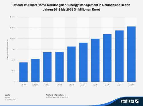 Der Umsatz in dem Segment „Energy Management“ des Marktes für Smart Home in Deutschland wird laut Prognosen zwischen 2023 und 2028 kontinuierlich um insgesamt 463,8 Millionen Euro (+56,62 Prozent) steigen. Nach dem neunten aufeinanderfolgenden Anstieg soll Prognosen zufolge der Umsatz im Jahr 2028 schätzungsweise 1,3 Milliarden Euro und damit einen neuen Höchststand erreichen. Besonders hervorzuheben ist, dass der Umsatz in dem Segment „Energy Management“ des Marktes für Smart Home in den vergangenen Jahren kontinuierlich gestiegen ist.