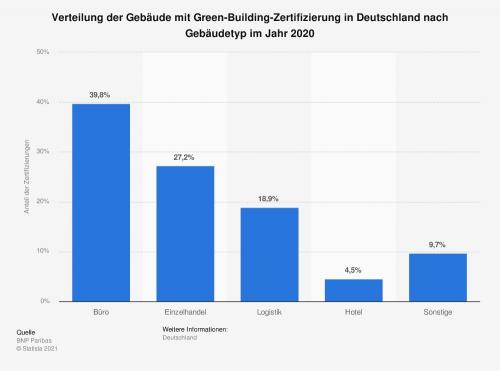 Die Statistik zeigt die Verteilung der Gebäude mit Green-Building-Zertifizierung in Deutschland nach Gebäudetyp im Jahr 2020 laut einer Erhebung der Großbank BNP Paribas. Im Jahr 2020 waren rund 18,9 Prozent der Gebäude mit Green-Building-Zertifizierung in Deutschland Logistikimmobilien.
