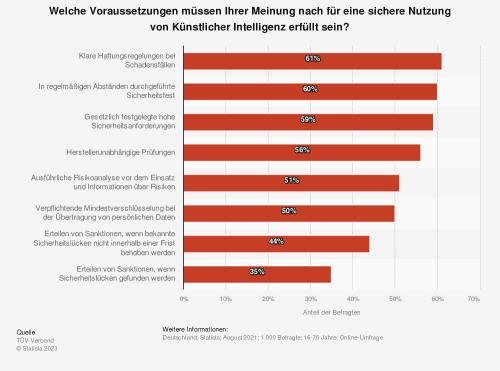Da Künstliche Intelligenz in diversen Gesellschaftsbereichen vermehrt Anwendung findet, ist die Erfüllung von Voraussetzungen für eine sichere Nutzung bedeutend. Sechs von zehn Befragten einer repräsentativen TÜV-Umfrage bewerten vor allem klare Haftungsregelungen bei Schadensfällen sowie regelmäßige Sicherheitstests als wichtige und zu erfüllende Voraussetzung in der Anwendung von KI.