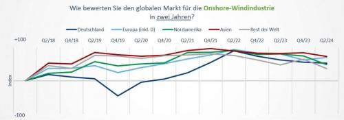 Die Windkraft-Branche geht weiterhin vom Wachstum ihres Geschäfts im Onshore-Bereich in zwei Jahren (2026) aus. Der Indexwert des Wind Energy Trend Index (Wetix) bewegte sich auch im zweiten Quartal 2024 im positiven Bereich über der grauen Nulllinie, geht aus dem im Juli 2024 veröffentlichten Wetix hervor. Allerdings fiel der Wachstumswert nur in Europa (hellblaue Linie) stärker aus als im Wetix ein halbes Jahr zuvor. In den anderen Kontinenten sank er. Im aktuellen Wetix wertete das Marktforschungsinstitut Wind Research 500