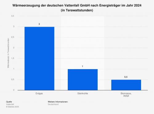 Die Statistik zeigt den Wärmeerzeugung der deutschen Vattenfall GmbH im Jahr 2024 nach Energieträger. Im Jahr 2024 wurden rund drei Terawattstunden Wärme aus dem fossilen Energieträger Erdgas gewonnen.