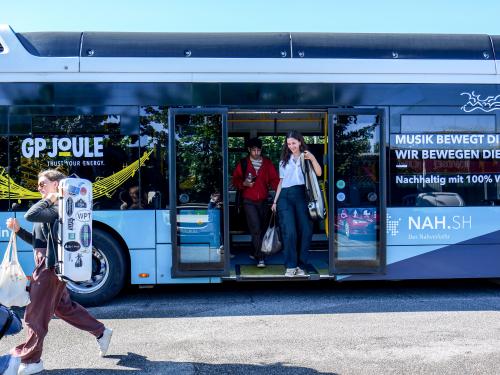 Zwei mit Wasserstoff betriebene Busse des Energieunternehmens GP Joule bringen die Musiker und Musikerinnen des „Schleswig-Holstein Musik Festival“ zum Veranstaltungsort in Rendsburg (Schleswig-Holstein). Rund 120 Musizierende aus der ganzen Welt kommen dort zusammen, um gemeinsam zu proben und sich auf ihre Auftritte vorzubereiten. 1987 gründete Dirigenten-Legende Leonard Bernstein das internationale Orchester des Festivals. Seither treffen sich im Sommer rund 120 junge Musiker (Höchstalter 26 Jahre) verschiedener Nationen in dem nördlichsten Bundesland, um von den Großen zu lernen. Nur die Besten – sie müssen sich vorab bei Probespielen in aller Welt qualifizieren – erhalten ein Stipendium für den Aufenthalt. GP Joule mit Sitz in Rendsburg ist Sponsor der Veranstaltung.