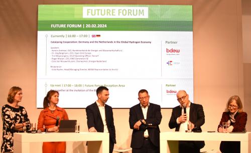 Hatten sich beim Future Forum das Thema Wasserstoffhochlauf vorgenommen: Kerstin Andreae vom BDEW, Cora Van Nieuwenhuizen, Chefin des niederländischen Energieverbandes, Tim Meyerjürgens, CEO Tennet, Roger Miesen, Vorstandsvorsitzender RWE Generation, Jörg Bergmann, CEO OGE Quelle: E&M/Drewnitzky |