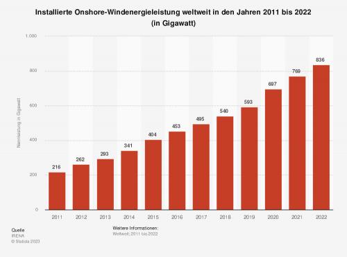Die Statistik zeigt die Entwicklung der installierten Onshore-Windenergieleistung weltweit in den Jahren 2011 bis 2022 nach Zahlen der Internationa Renewable Energy Agency (Irena). Die Leistung der weltweit an Land installierten Windenergieanlagen betrug im Jahr 2022 insgesamt rund 836