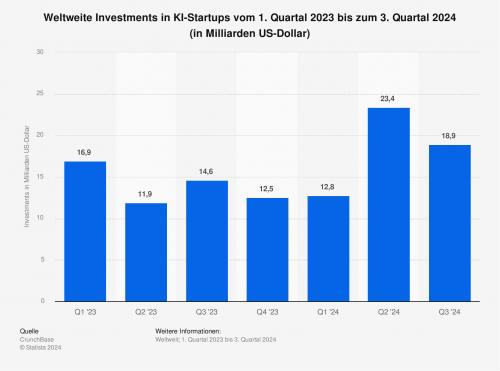 Im dritten Quartal 2024 lagen die weltweiten Investitionen in KI-Start-ups weltweit bei 18,9