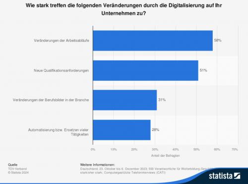 Prozent der Befragten, die im Jahr 2023 im Rahmen der TÜV-Weiterbildungsstudie befragt wurden. Daneben entstehen nach Einschätzung von gut der Hälfte der Unternehmen neue Anforderungen an die Qualifikation der Beschäftigten (51