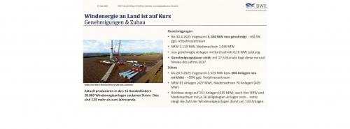Genehmigungen und Zubau auf WachstumskursDer Ausbaustand der Windenergie an Land hat sich in den ersten Monaten 2025 weiter verbessert. Nach Angaben des BWE sind aktuell 28.869