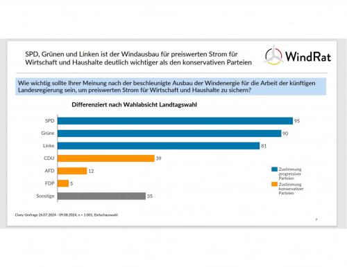 Obwohl Windkraft ein potenzieller Treiber für die regionale Wirtschaft darstellen und für niedrige Strompreise sorgen kann, zeigen die Umfrageergebnisse laut Windrat, dass nur 43 Prozent der CDU-Wähler, 11 Prozent der AfD-Wähler und nur 4 Prozent der FDP-Wähler diesen Aspekt für wichtig erachten. Anders sieht es bei den Parteien Linke, SPD und Grünen aus, von denen 81 Prozent bis 95 Prozent den Ausbau der Windenergie als eine zentrale Aufgabe der zukünftigen Landesregierung sehen.