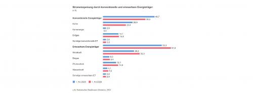 Stromeinspeisung durch konventionelle und erneuerbare Energieträger im ersten Halbjahr 2023 (blaue Balken) und 2024 (rote Balken). Zum Vergrößern bitte auf die Grafik klicken Quelle: Destatis |