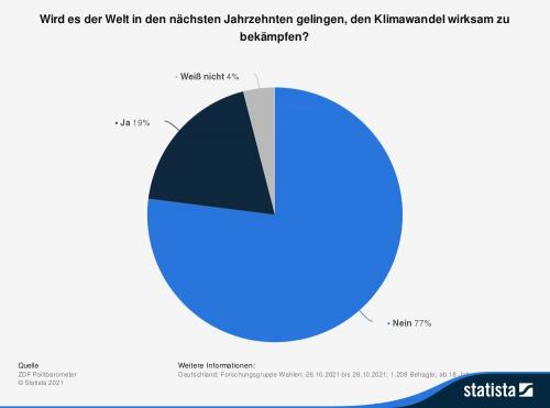 In einer im Oktober 2021 durchgeführten Umfrage waren 77% der befragten Personen der Meinung, dass es der Welt in den nächsten Jahrzehnten nicht gelingen wird, den Klimawandel wirksam zu bekämpfen. 19 % waren zuversichtlich und halten eine erfolgreiche Bekämpfung der globalen Erderwärmung für möglich.