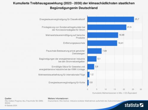 Eine Studie des Öko-Instituts aus dem Jahr 2024 hat die staatlichen Begünstigungen beziehungsweise weitere Maßnahmen außerhalb des Subventionsberichtes mit Blick auf ihre Klimawirksamkeit untersucht. Dabei kam die Studie zu dem Ergebnis, dass die Energiesteuervergünstigung für Dieselkraftstoff sowie die Privilegierung von Sondervertragskunden bei der Konzessionsabgabe für Strom die klimaschädlichste Wirkungen haben. Durch die Privilegierung von Sondervertragskunden bei der Konzessionsabgabe für Strom etwa sollen zwischen 2023 und 2030 Mehremissionen in Höhe von rund 22 Millionen CO2-Äquivalent ausgestoßen werden.