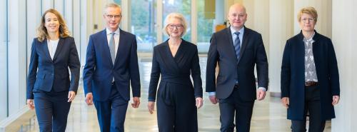 Ausgelächelt: die Wirtschaftsweisen, von links Ulrike Malmendier, Martin, Werding, Vorsitzende Monika Schnitzer, Achim Truger und Veronika Grimm, hier vor der Übergabe ihres Konjunkturberichts 2023 an den Kanzler Quelle: Bundesregierung / Jesco Denzel |