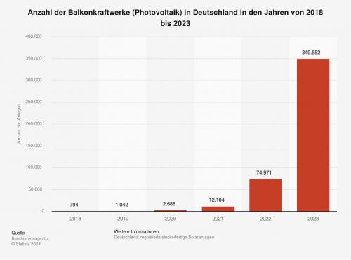 Im Jahr 2023 waren nach Angaben der Bundesnetzagentur insgesamt knapp 350.000 Balkonkraftwerke in Deutschland in Betrieb. Das ist mehr als das Dreifache als im Vergleich zum Vorjahr und damit der größte Zubau seit 2018.