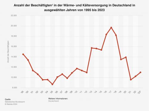Die Statistik zeigt die Anzahl der Beschäftigten in der Wärme- und Kälteversorgung in Deutschland in den Jahren 1991 bis 2023 nach Zahlen des Statistischen Bundesamts. Im Jahr 2023 waren rund 11.000 Personen im Bereich Wärme- und Kälteversorgung in Deutschland tätig.