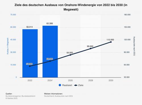 Bis August 2024 betrug der Ausbau der installierten Leistung von deutschen Onshore-Windenergieanlagen rund 62 Gigawatt. Da der Anteil der erneuerbaren Energien an der Stromversorgung in Zukunft stark ansteigen soll, wurden im Erneuerbare-Energien-Gesetz (EEG) Ausbauziele für die Onshore-Windenergie beschlossen: Im Jahr 2030 sollen Windenergieanlagen an Land mindestens 115 Gigawatt erzeugen.