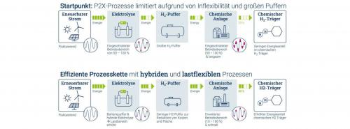 Synthese bislang an konstante Versorgung gekoppeltUm den Vorteil des Ammoniaks in einem klimafreundlichen Energiesystem der Zukunft nutzen zu können, muss laut den Wissenschaftlern ein Nadelöhr überwunden werden: So sei die Ammoniak-Synthese darauf angewiesen, konstant mit Stickstoff und Wasserstoff versorgt zu werden. Stickstoff kann jederzeit aus der Luft gewonnen werden. Wasserstoff muss dem Prozess zugeführt werden. Das wird zur Herausforderung, wenn Ammoniak künftig mit grünem Wasserstoff hergestellt werden soll. Dieser stammt aus der Elektrolyse und liegt nur dann vor, wenn er mit grünem Strom produziert wird. Grüner Strom aus Sonnen- und Windkraft steht jedoch nicht gleichbleibend zur Verfügung − im Gegensatz zu Erdgas, mit dessen Hilfe grauer Wasserstoff gewonnen wird, der bisher bei der Ammoniak-Synthese zum Einsatz kommt.