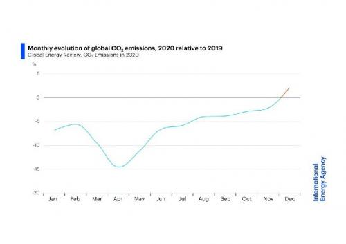 Das geht aus den jüngsten Daten der Internationalen Energieagentur (IEA) hervor, die am 2. März in Paris veröffentlicht wurden. Die Pandemie habe über das gesamte Jahr 2020 zum stärksten Rückgang der weltweiten CO2-Emissionen geführt: - 6 %, schreiben die Experten der IEA. Dahinter verbergen sich aber regional und über das Jahr verteilt sehr unterschiedliche Entwicklungen. Die Emissionen im Dezember 2020 überstiegen den Vorjahreswert weltweit um 60 Mio. Tonnen.