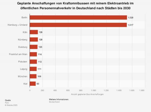 Die Städte Berlin und Hamburg planen bis zum Jahr 2030 die Anschaffung von jeweils über 1.500 E-Bussen. Damit wären die Flotten der Berliner Verkehrs Betriebe (BVG) und Hamburger Hochbahn als Betreiber der Busse größtenteils emissionsfrei. Die Zahlen basieren auf Angaben von Pricewaterhouse Coopers.