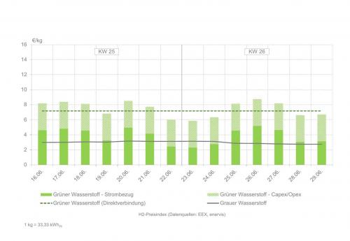 | H2-Preisindex für die Kalenderwochen 25 und 26 (zur Vollansicht bitte auf die Grafik klicken) Quelle: enervis energy advisors GmbH / EEX |